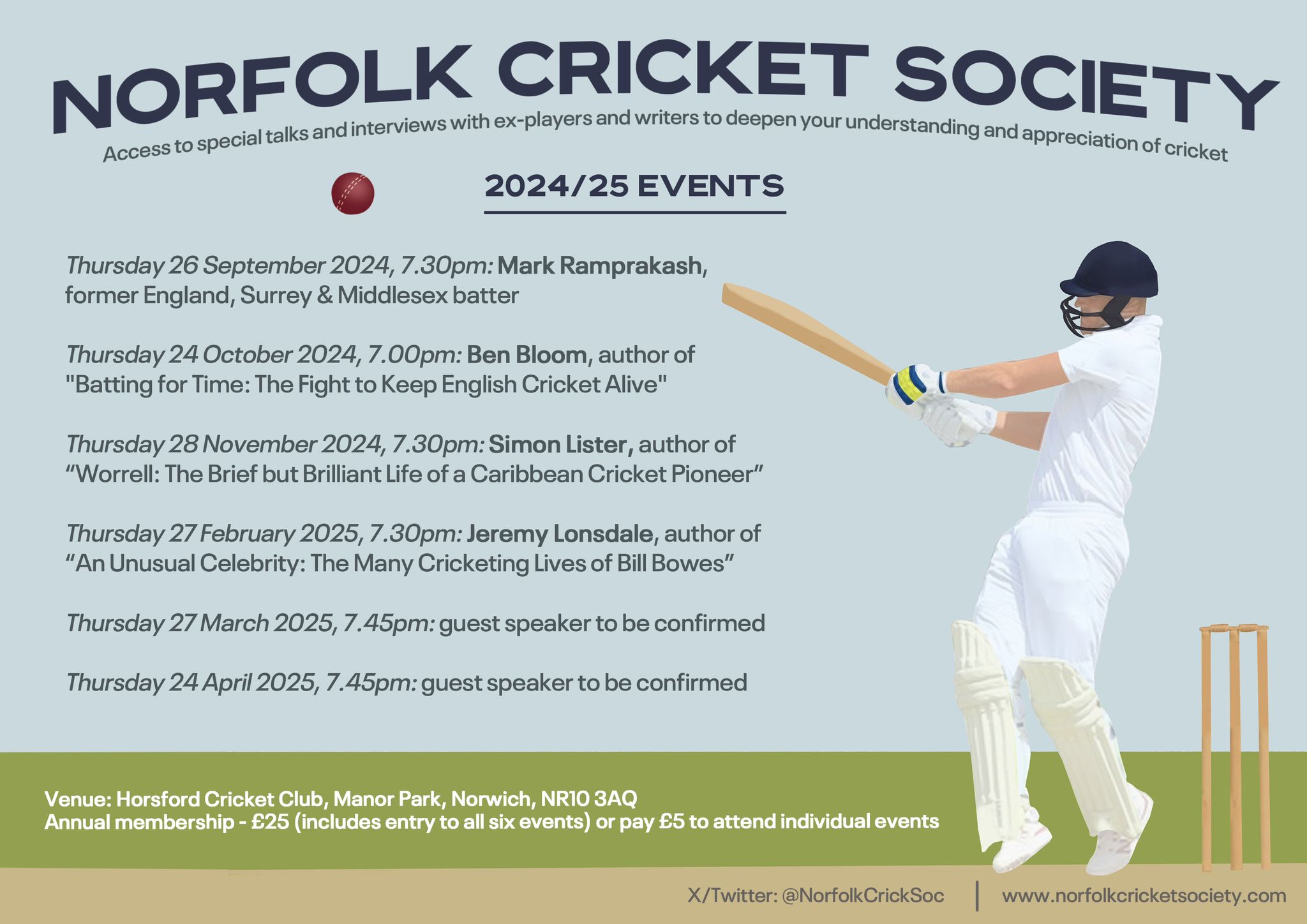 July 30, 2024 by Norfolk Cricket Society Events for 2024/25 Our 2024/25 programme of events is shaping up nicely with Mark Ramprakash, Ben Bloom, Simon Lister and Jeremy Lonsdale all lined as guests. Details of the March and April 2025 events coming soon. Share this: Click to share on X (Opens in new window) X Click to share on Facebook (Opens in new window) Facebook Like Loading... Related